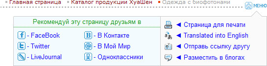 Сервисное меню - доступно на каждой странице сайта www.HuaShen.BIZ и открывается кнопкой  С помощью этой "Волшебной кнопки" - вы сможете: — распечатать любую страницу сайта, — перевести любую страницу сайта на английский или другой из 57 языков, — рекомендовать выбранную страницу вашему другу, — разместить ссылку и описание выбранной страницы - для обсуждения в популярных социальных сетях, участником которых вы являетесь.