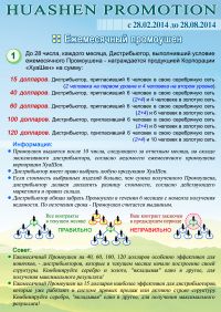 До 28 числа, каждого месяца, Дистрибьютор, выполнивший условие ежемесячного Промоушена - награждается продукцией Корпорации «ХуаШен» на сумму:
